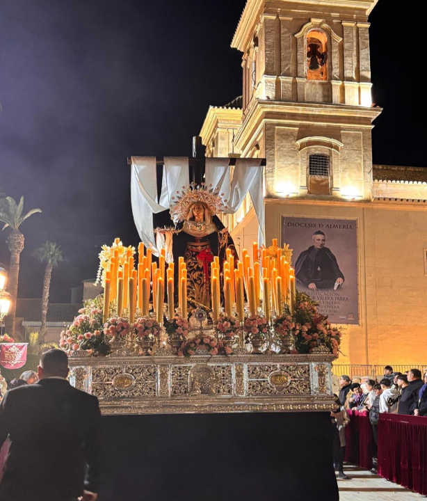 única. En la tarde del Viernes de Dolores, la Virgen se presenta de manera majestuosa y distinta a